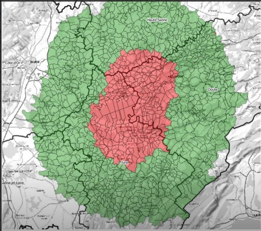Depuis le cas avéré de Pouilley-Français, les zones qui avaient déjà été mises en place fin octobre lors du premier déclenchement du protocole autour des foyers D.N.C. à Écleux (Jura) ont ainsi été élargies à d’autres communes du Doubs. Si l’est et le nord du Pays Horloger sont épargnés de Morteau à Maîche, ce n’est pas le cas plus à l’ouest et au sud. Les com’com Entre Doubs et Loue et des Portes du Haut-Doubs sont incluses dans le périmètre vert dit de surveillance.