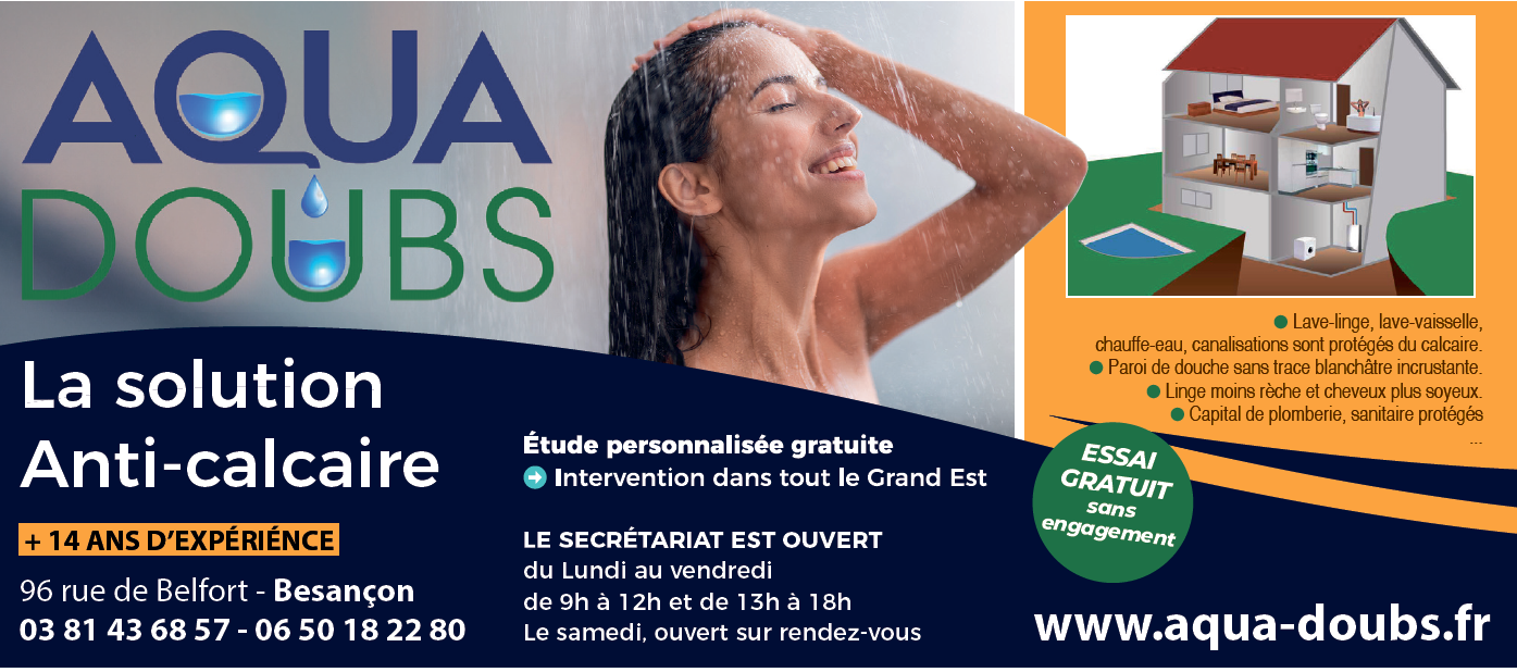 Aqua Doubs, est aujourd’hui parmi les rares entreprises en France à proposer à ses clients un essai gratuit sans engagement d’achat ni caution ni condition dans toute la région du grand est jusqu’aux frontières du Luxembourg, la suisse et l’Allemagne. Implantée au coeur de Besançon, au 96 rue de Belfort la société Aqua Doubs s’impose comme un acteur de référence dans le traitement physique du calcaire pour les maisons individuelles, copropriétés, industries et collectivités ainsi qu’autres domaines. Son expertise repose sur une parfaite connaissance des problématiques locales et une exigence constante de qualité dans chaque installation. Aujourd’hui, Aqua Doubs accompagne des milliers de clients dans tout le Grand Est, avec une approche sur mesure et un haut niveau de service.