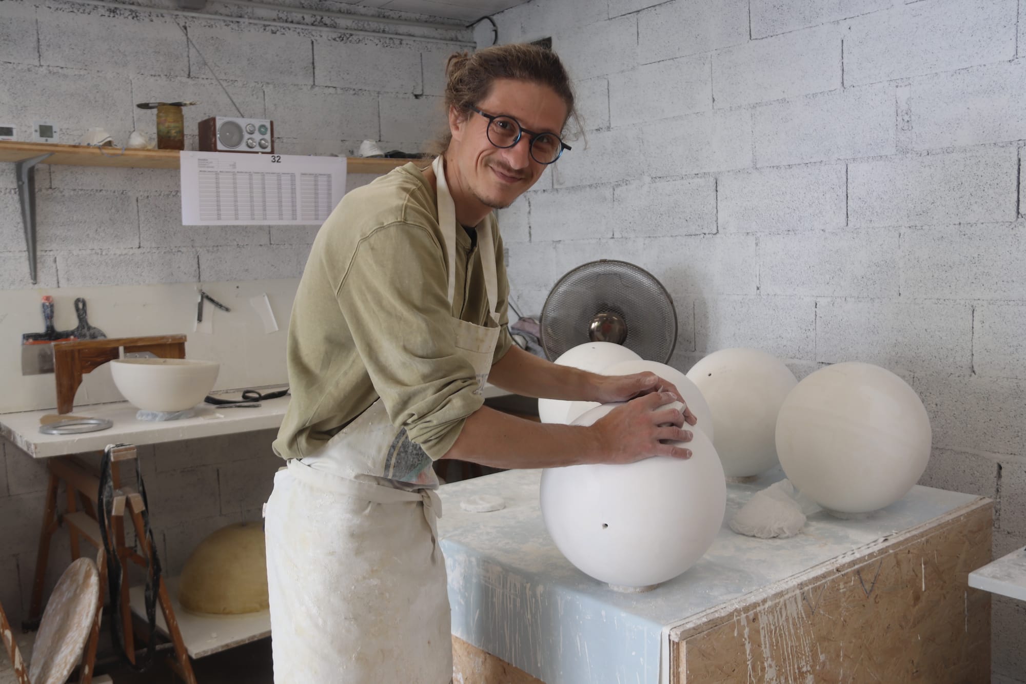 Chaque geste, chaque outil, chaque carte, chaque couleur proposée a été inventée par Alain Sauter. Première étape : la fabrication de globes en staff, mélange de plâtre et de fibre, ici de la jute. “La fibre permet de solidifier et alléger l’ensemble. Très vite, il y a eu une idée très forte : je voulais des globes les plus durables possibles dans les deux sens du terme, c’est-à-dire qu’ils puissent traverser les générations et être solides et réparables par un artisan d’art, avec un impact carbone le plus bas possible”, explique Alain.