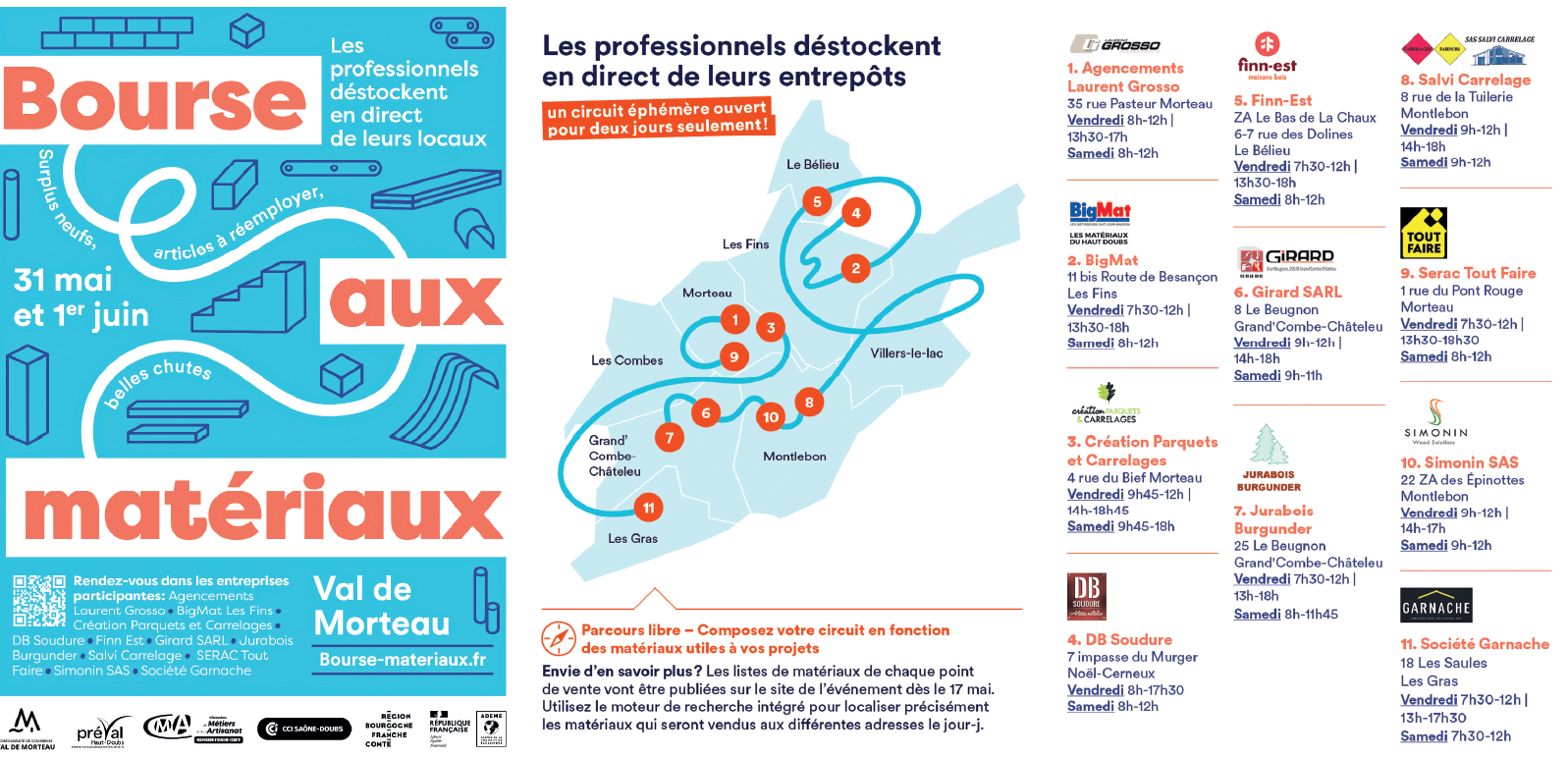 La Bourse aux Matériaux revient pour une troisième édition les vendredi 31 mai et samedi 1er juin sur le Val de Morteau ! À cette occasion, 11 entreprises locales ouvrent leurs portes pour proposer à la vente leurs surplus et matériaux à réemployer !