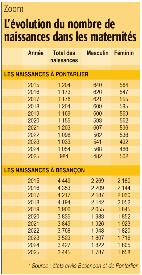 Dans cette évolution morose, le département du Doubs continue bon an mal an à tirer son épingle du jeu. “Le croisement des courbes entre les naissances et les décès s’est réalisé seulement en 2024 dans le Doubs” observe Charles Pilarski, chef du service Études et diffusion de l’I.N.S.E.E. Bourgogne-Franche-Comté. En 2023, on a enregistré autant de naissances que de décès dans le Doubs (5 116 précisément) et en 2024, la courbe des décès (5 142) est passée au-dessus de celle des naissances (4 976) pour la première fois. “Le Doubs était le dernier des huit départements de B.F.C. qui avait encore un solde naturel positif. L’an prochain, tous auront un solde naturel négatif dans la région.” À l’échelle de la région, 22 500 bébés seulement sont nés en 2024 en Bourgogne-Franche-Comté, c’est un niveau historiquement bas, et “l’une des plus fortes baisses de France métropolitaine.” C’est le plus faible nombre de naissances enregistrées dans la région depuis cinquante ans.