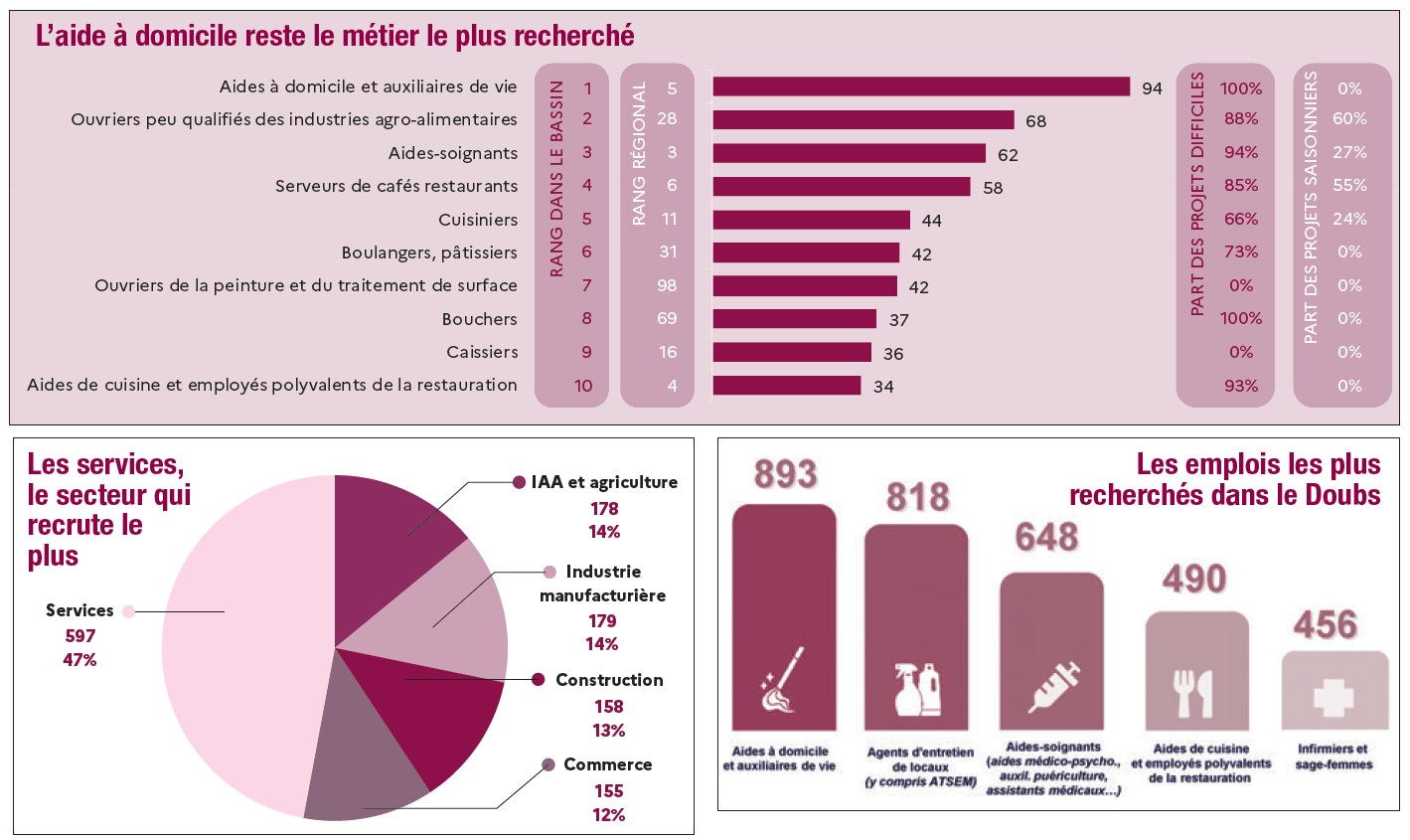 Tous les ans, France Travail publie une enquête sur les besoins en main-d’œuvre des entreprises dans le Doubs. Les métiers les plus recherchés sur le bassin de Morteau sont les aides à domicile, les ouvriers peu qualifiés dans l’industrie agroalimentaire, les aides-soignants, les serveurs de café-restaurant, les cuisiniers, les boulangers-pâtissiers, les peintres, les bouchers, les caissiers, et les aides de cuisine. "Même dans les métiers les plus recherchés, l’industrie manufacturière n’y figure pas", note Delphine Rossit qui souligne par ailleurs que des projets de recrutement sont tout de même en cours, bien qu’inférieurs à l’année dernière.