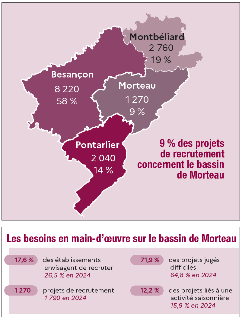 En mars, sur Morteau, il y a eu 2 620 demandeurs d’emploi en plus en catégorie A, soit une augmentation de 26,5 % en un an. Toutes catégories confondues, l’augmentation est de 18,6 % pour 4 338 demandeurs. Pour autant, les offres d’emploi ont augmenté de près de 4 % (plus de 3 000 offres) montrant que des entreprises sont à la recherche de compétences. En 2025, 1 270 intentions d’embauches ont été comptabilisées sur le bassin de Morteau (contre 1 790 en 2024).