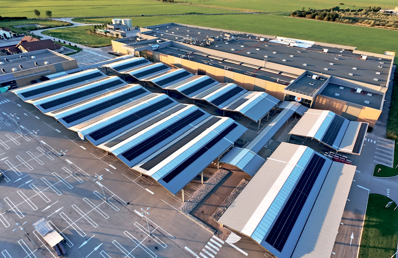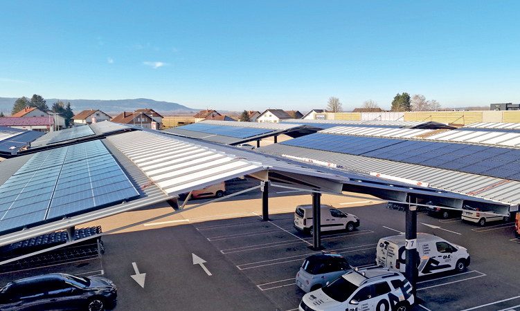 L'entreprise spécialisée dans le solaire a posé 2 300 m2 de panneaux photovoltaïques résistants et à haut rendement sur le toit du parking couvert de l’hypermarché d’Houtaud qui autoproduit désormais 17% de sa consommation énergétique.