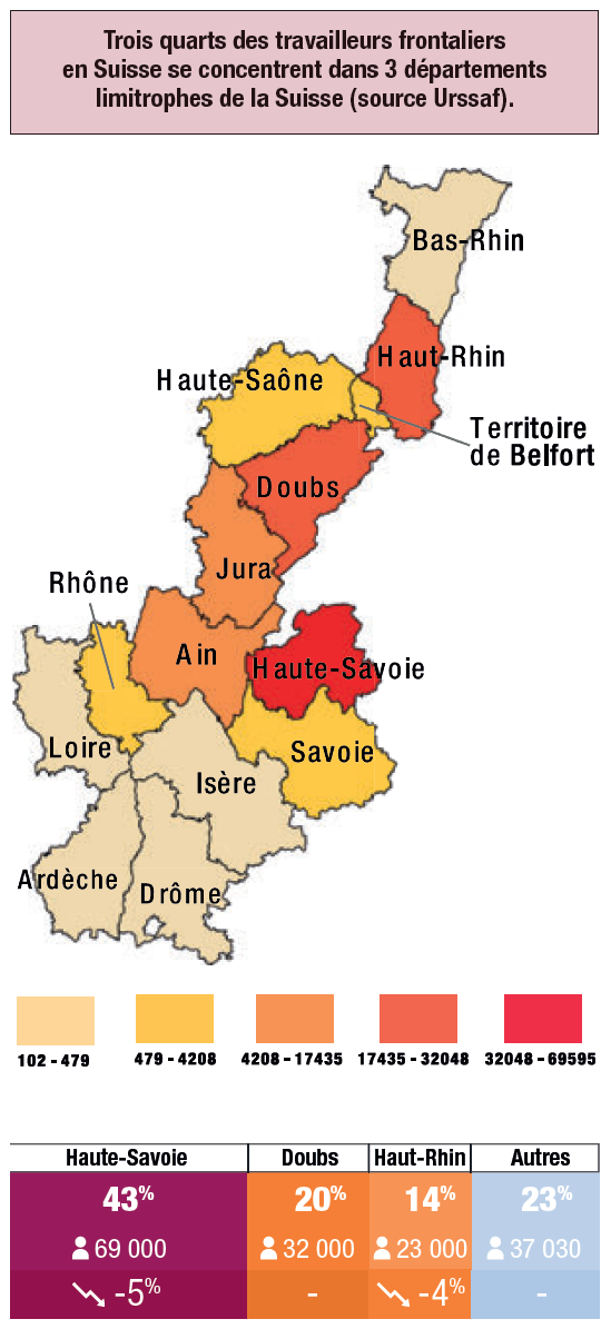 Sur l’ensemble des 224 000 frontaliers français travaillant en Suisse, et résidant en Alsace, en Bourgogne-Franche-Comté ou en Auvergne-Rhône-Alpes, 68 % d’entre eux, soit 152 000 ont fait le choix de payer leur assurance maladie en France et sont donc gérés par l’Urssaf. « Le nombre de travailleurs frontaliers français est globalement en hausse, ils sont désormais 224 000, mais ceux qui sont affilés à l’Urssaf sont en baisse, ils sont passés de 157 700 à 152 000 en un an » constate Djor-Krévys Mouëza, le directeur par intérim de l’Urssaf Franche-Comté. Si on y ajoute les retraités frontaliers, ils sont 161 000 à cotiser à l’Urssaf. « Le nombre d’affiliés à l’Urssaf est en baisse parce qu’il paraît plus intéressant pour certaines catégories de frontaliers (célibataires à hauts revenus par exemple) de s’assurer en Suisse » avance Amandine Durupty-Perriand, pilote du service des travailleurs frontaliers en Suisse à l’Urssaf Franche-Comté.
