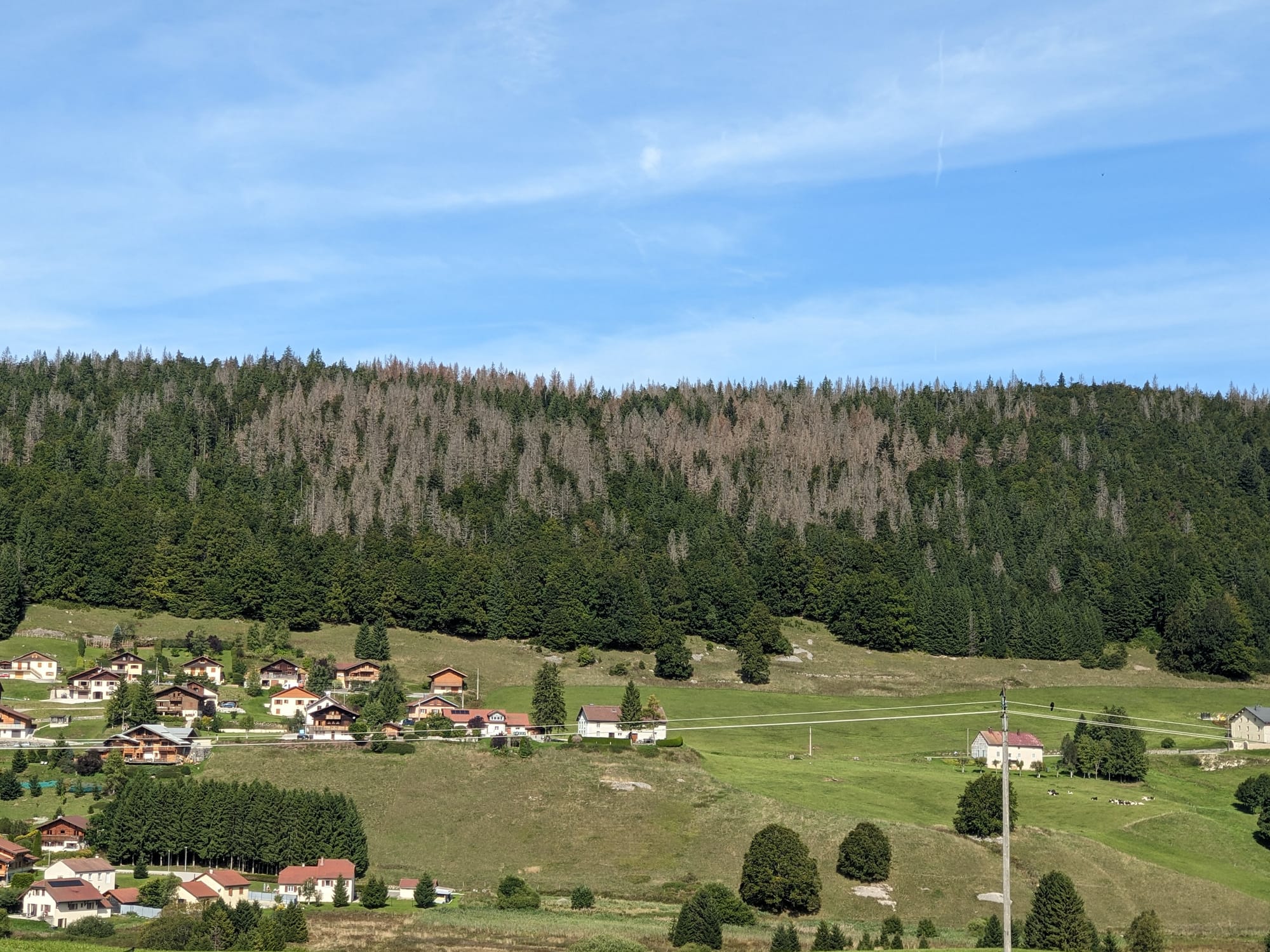 L’épidémie de typographes a basculé sur la haute chaîne après la sécheresse de 2022. Elle sévit toute particulièrement sur la partie sud du massif jurassien, entre Pontarlier et La Pesse alors que le secteur Pontarlier-Maîche est relativement épargné. Comment expliquer cette différence ? « On a émis plusieurs hypothèses sur le secteur nord où l’épicéa a toujours été moins présent dans les paysages. L’explication principale tiendrait au fait que le secteur nord a été plus touché par les orages en 2022-2023, ce qui l’a aussi préservé du typographe. Cette différence nord-sud est aussi d’actualité côté suisse où le territoire correspondant au canton de Neuchâtel est moins touché que sur la partie vaudoise », avance Mathieu Mirabel. Difficile de nier l’impact du dérèglement climatique.