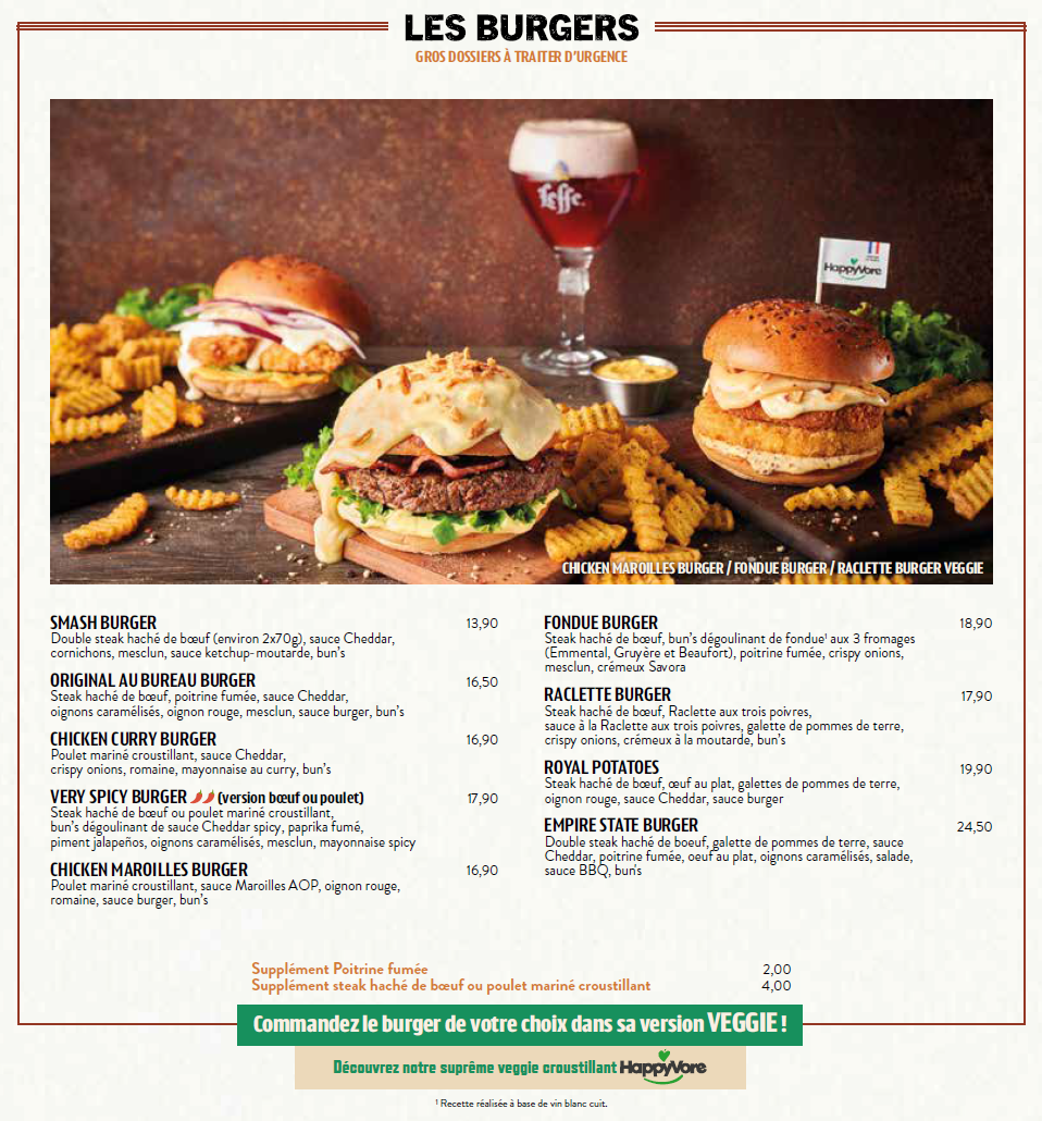 La nouvelle carte cultive les saveurs de saison automne-hiver. Parmi les nouveautés, il y a le Fondue Burger, gourmand à souhait, entre sa poitrine fumée et ses trois fromages (emmental, gruyère, beaufort) fondus. Dans la catégorie des burgers dégoulinant de fromage fondu, on retrouve le Raclette Burger avec son fromage à raclette aux trois poivres, sa galette de pommes de terre et son steak haché de bœuf. Les gourmands qui veulent goûter aux saveurs du Nord, le Chicken Maroilles Burger est fait pour eux, avec son poulet mariné croustillant et du généreux maroilles A.O.P. Les flammekueches prennent l’accent ch’ti avec la Flam’ au Maroilles.