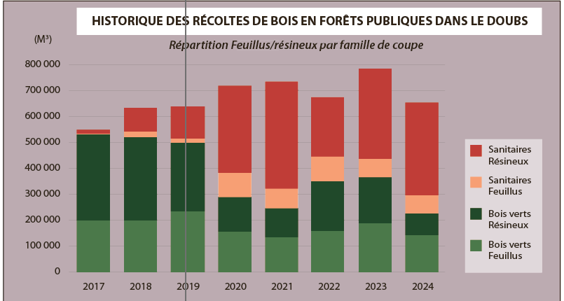 J.-L.F. : C’est assez encourageant. Les scieries ont de l’activité. Il y a une forte demande de bois. Des grosses scieries à l’extérieur de la Franche-Comté recherchent aussi de l’épicéa jurassien. Le marché du bois-énergie s’envole. Ce qui suscite des inquiétudes sur la ressource. Grâce à l’évolution des paramètres sanitaires et économiques, on devrait pouvoir desserrer l’étau de 30 % de récolte de bois vert résineux négocié avec les communes forestières en 2024. Il est important de dire qu’on se garde toujours une marge sur ce taux qui peut varier en fonction de la demande sur certains produits. Sur l’année 2024, on était finalement plus proche de 50 %.