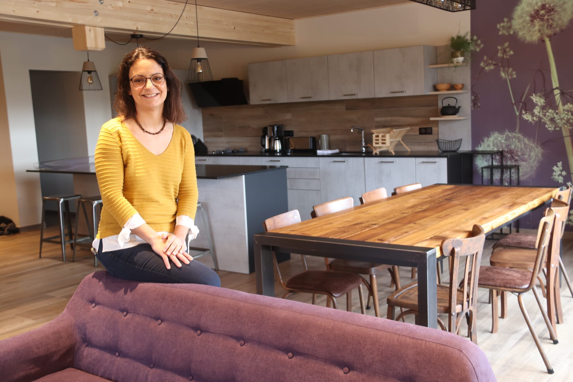 Après de gros travaux pour créer leur cocon familial, dans la ferme dédiée à la production de comté, qu’elle et son mari ont acquise en 2009, Anne-Émilie Sordel lance il y a plus de deux ans la rénovation de l’ancienne grange à foin pour la création de deux gîtes. La coopérative Myotte-Duquet s’attelle au démontage du hangar et ne garde que les parties maçonnées. Les deux gîtes, le premier côté ouest qui compte 8 places, et côté est avec 15 places, accessible pour les personnes à mobilité réduite, voient le jour après plus de 18 mois de travaux. “On a voulu se démarquer du style montagnard, avec une ambiance chaleureuse et moderne”, note Anne-Émilie.