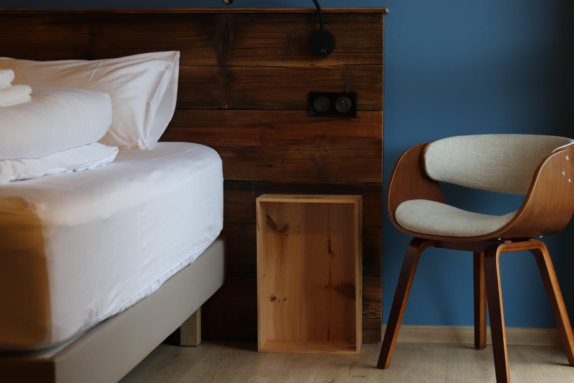 Chaque gîte dispose de son espace détente. Chaque chambre, nommée d’après un animal de la région, possède sa propre salle de bains. Pour la décoration et l’aménagement intérieur, Anne-Émilie a tenu à mettre en valeur le plus possible les savoir-faire locaux et français, tout en privilégiant la récupération et la seconde main. Ainsi, la jeune femme a travaillé avec les Ateliers du Feu de Grand’Combe-Châteleu. Benoît Vuillemin a notamment conçu les structures métalliques des tables ou encore des penderies dans les chambres. Le mari d’Anne-Émilie, passionné par le travail du bois, a fabriqué le tablier de la table ou les étagères à partir de l’ancien plancher de la grange. Les têtes de lit ont été confectionnées aussi par de la récupération.