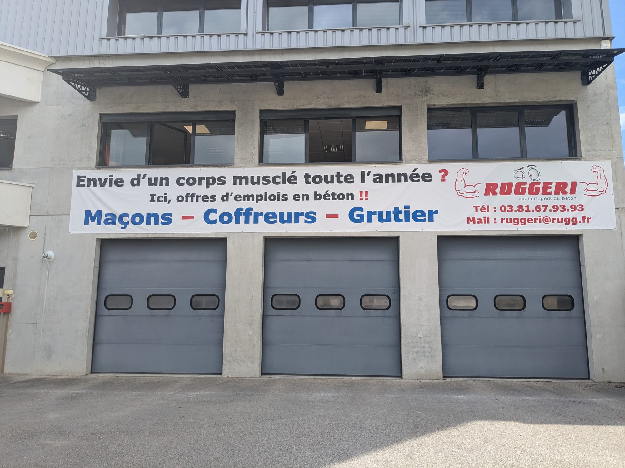 “Envie d’un corps musclé toute l’année ? Ici, offres d’emploi en béton !!” La banderole, affichée depuis début juillet sur l’une des façades de l’entreprise des Fins ne manque pas d’interpeller les automobilistes, ils sont 8 000 chaque jour, qui empruntent la route des microtechniques en venant de Morteau. Et le “logo” qui accompagne le message, deux beaux bras musclés qui sortent de l’enseigne Ruggeri, apporte l’indispensable touche de virilité et d’humour recherchée dans l’opération. “On a déjà des retours”, annonce Philippe Jacquot, le gérant de Ruggeri.