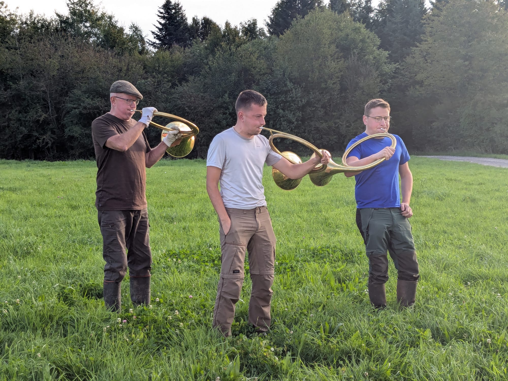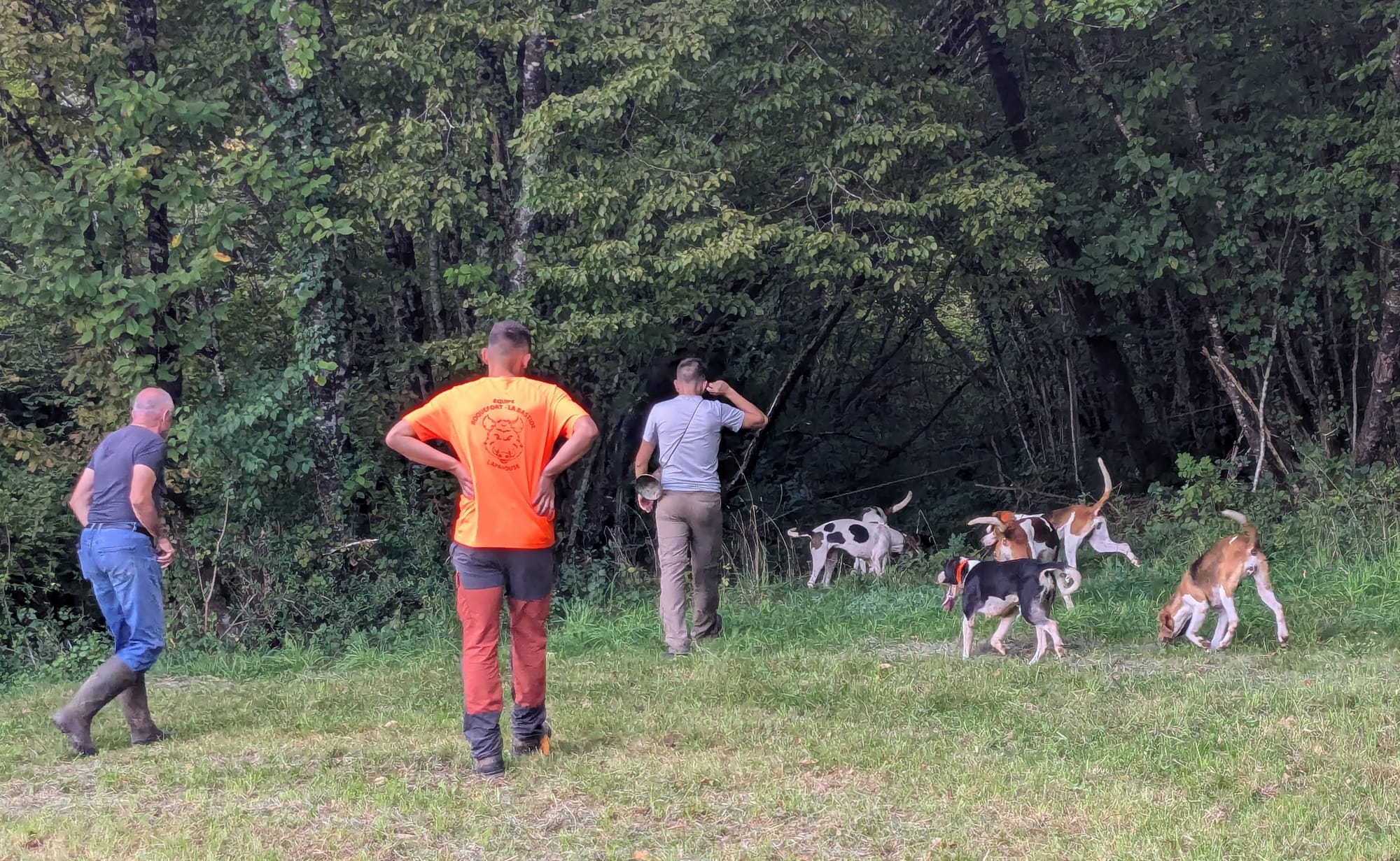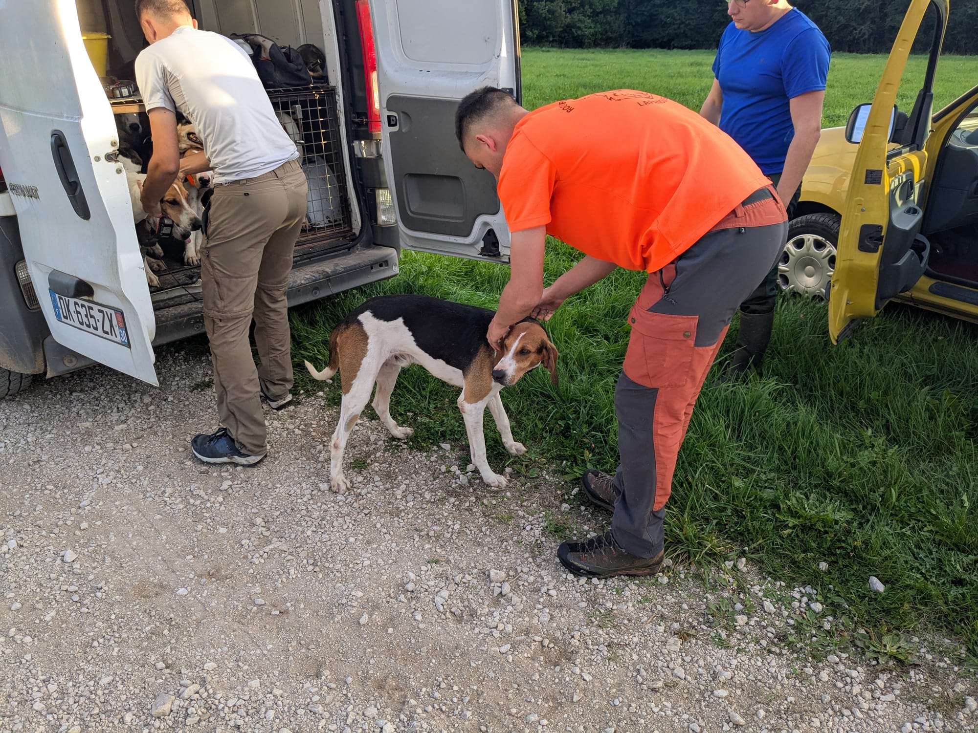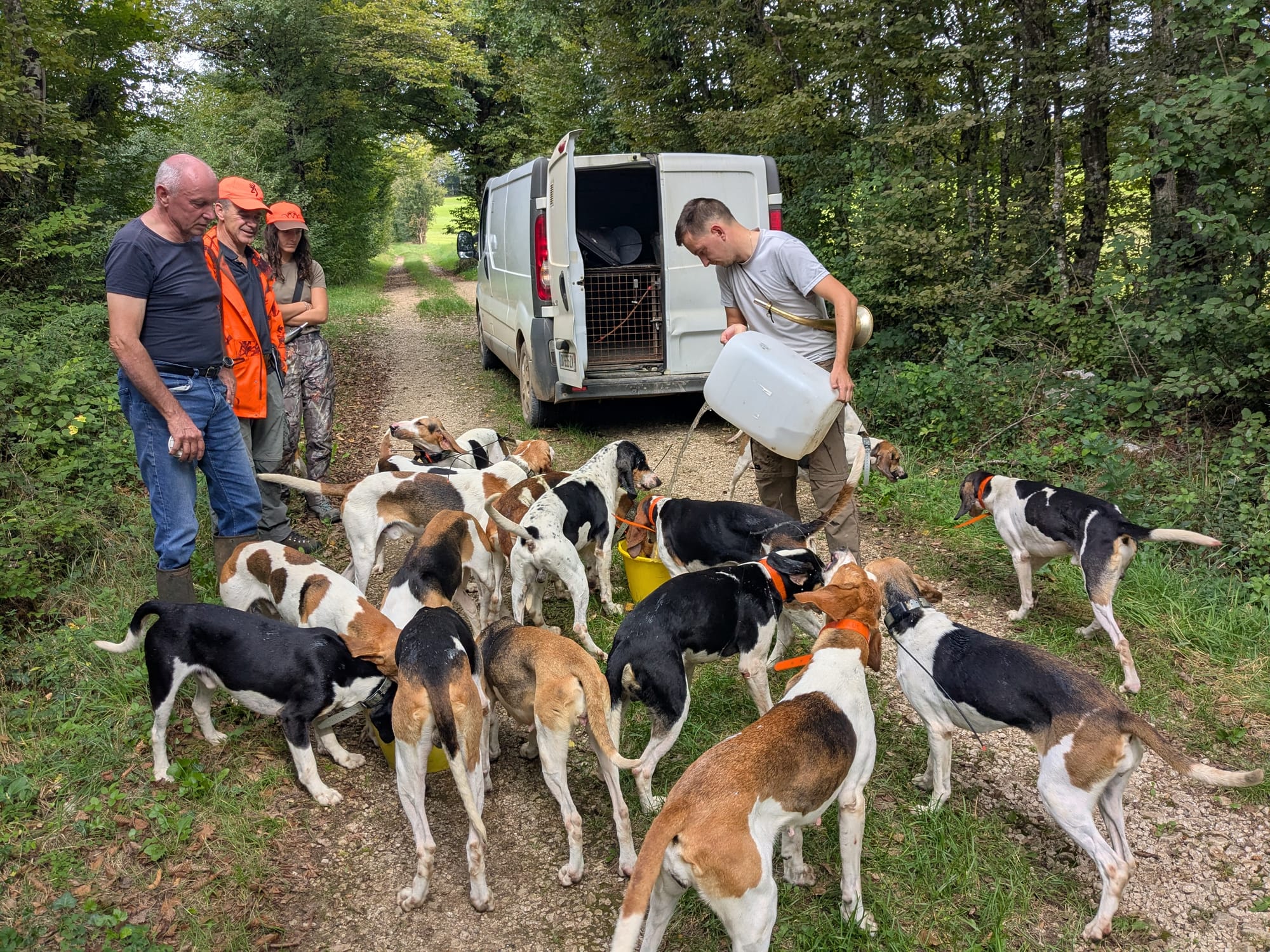 Tradition oblige, tout commence en musique, Robin Cart, son oncle Jérôme et Maxime, un autre passionné de chasse à courre entonnent à la trompe de chasse la fanfare ou morceau intitulé Point du jour. Tous les chiens sont ensuite équipés de colliers G.P.S. C’est une utilisation intelligente à mon sens de la technologie. Elle nous permet de récupérer plus facilement les chiens, de les repérer quand ils arrivent près d’une route à forte circulation et de pouvoir sécuriser cette traversée de route. En revanche, qu’on utilise des colliers G.P.S. pour suivre le gibier en 4 X 4, c’est-à-dire recouper une chasse, je trouve ça insupportable, estime Hervé Cart.