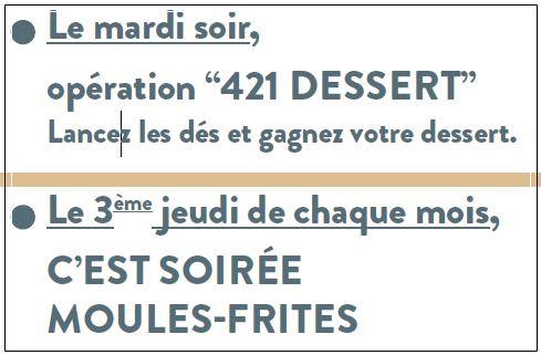 Dans le groupe, toutes les idées sont les bienvenues pour dynamiser le restaurant pub-brasserie et créer l’envie chez les clients. Parmi les nouveautés, il y a le “421 dessert”, l’événement du mardi soir. Le principe est simple : si le client fait un 421 en lançant les dés, son dessert lui est offert. Ce n’est pas tout. “À partir de maintenant, le 3ème jeudi du mois, nous organisons la soirée moules-frites. Ça commence en avril !” Convivial et festif ! Pour cet été, Mickaël et son équipe réfléchissent à des soirées barbecue durant lesquelles les matches du Mondial de football seront retransmis sur des écrans.