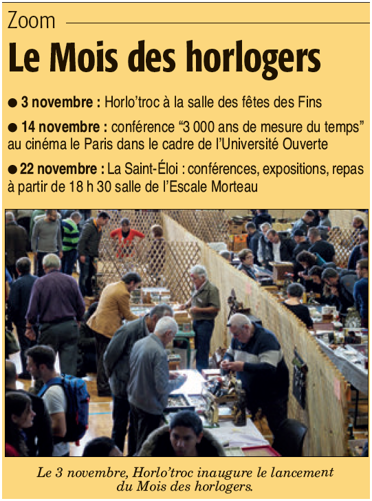 Organisée par la com’com du Val de Morteau, cette Saint-Éloi figure désormais au programme du Mois des horlogers avec Horlo’troc aux Fins le 3 novembre et la conférence “3 000 ans de mesure du temps” organisée le jeudi 14 novembre au cinéma Le Paris dans le cadre de l’Université Ouverte.