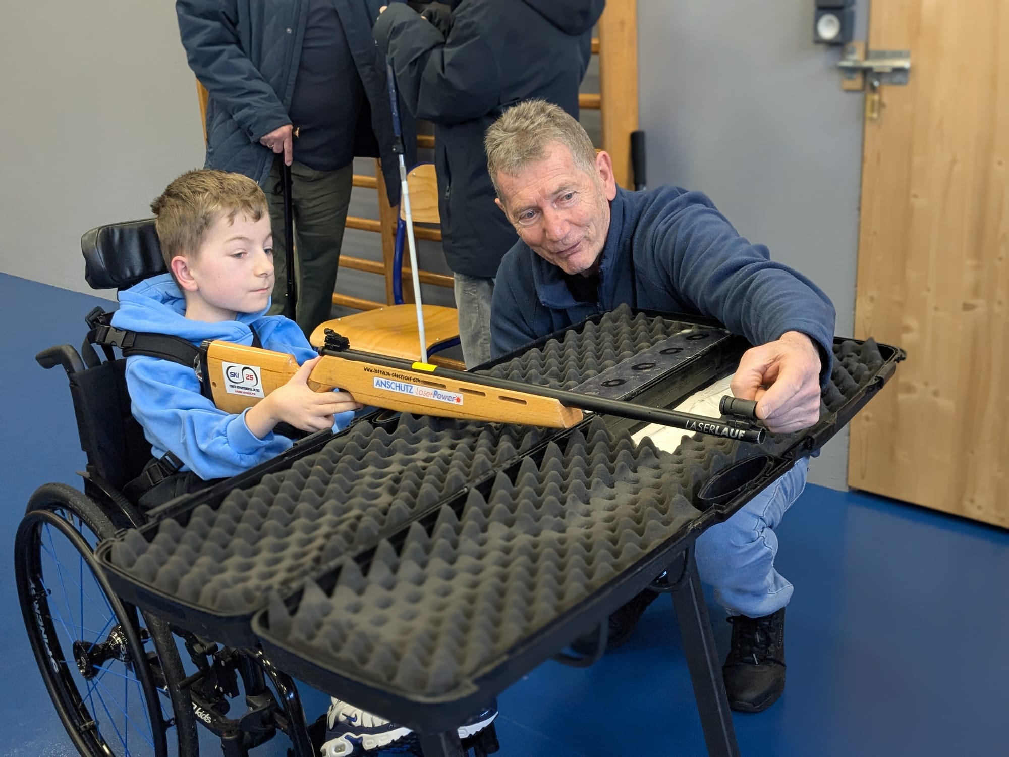 Souffrant d’amyotrophie, Léony 12 ans est plus limité en mobilité. Sur son fauteuil, il teste le tir laser à la carabine avec l’aide d’Yvan Bailly, le président de l’association Handisport Pontarlier-Morteau-Maîche qui l’aide à positionner l’arme. Le jeune tireur éteint rapidement les cinq cibles sous les yeux de sa maman aussi heureuse que son fils. “Le tir, j’aime bien”, explique Léony qui est aussi un brillant élève scolarisé en classe de 5ème au collège Jeanne-d’Arc.