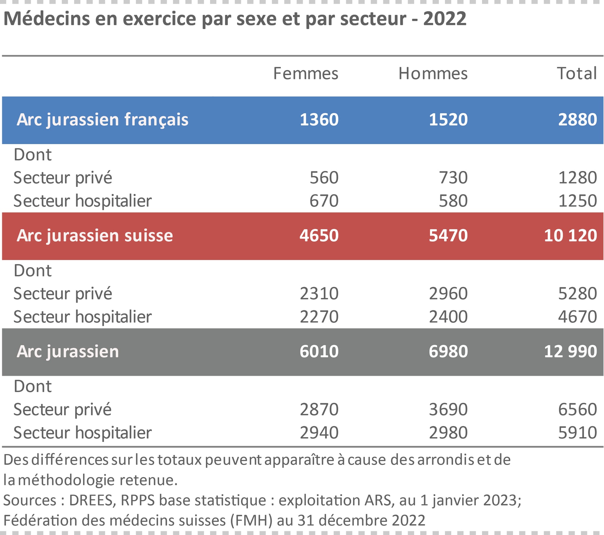Au 1er janvier 2023, plus de 13 000 médecins et spécialistes exercent dans l’Arc jurassien avec une densité de 30 médecins pour 10 000 habitants côté France contre 48 médecins pour 10 000 habitants sur la partie suisse. La part d’hommes dans la profession est légèrement supérieure à celle des femmes de chaque côté de la frontière. L’Arc jurassien franco-suisse compte 3 100 médecins de proximité, catégorie regroupant les généralistes et les pédiatres, lesquels sont plus nombreux sur la partie suisse. Le recours à la pédiatrie varie d’un pays à l’autre. En Suisse, les consultations de médecine de proximité destinées aux enfants de moins de 5 ans sont assurées à 90 % par des pédiatres. Le recours au médecin généraliste plutôt qu’au pédiatre reste minoritaire jusqu’à la fin de l’adolescence. À l’inverse, en France, plus de 40 % des enfants de 0 à 3 ans sont suivis uniquement par un généraliste. Le recours au pédiatre reste donc minoritaire en France où la moitié des pédiatres exerce dans un hôpital.