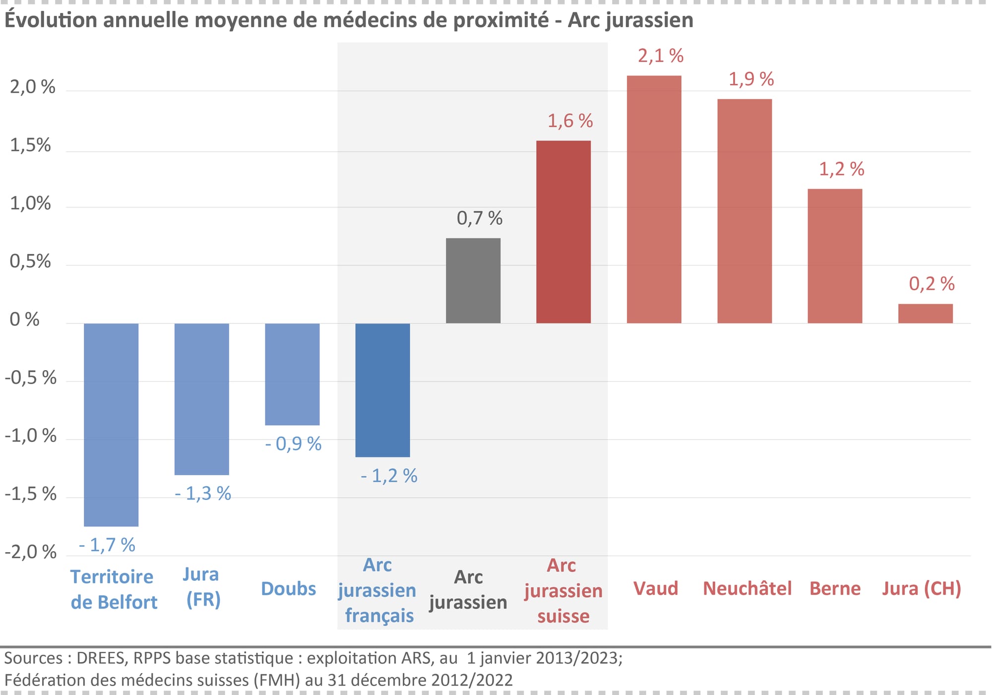 L’observatoire statistique transfrontalier de l’Arc jurassien a analysé l’offre de soins sur le territoire frontalier, qui reflète des tendances démographiques et structurelles, voire culturelles, bien distinctes de part et d’autre de la frontière. C’est particulièrement significatif au niveau des médecins de proximité.