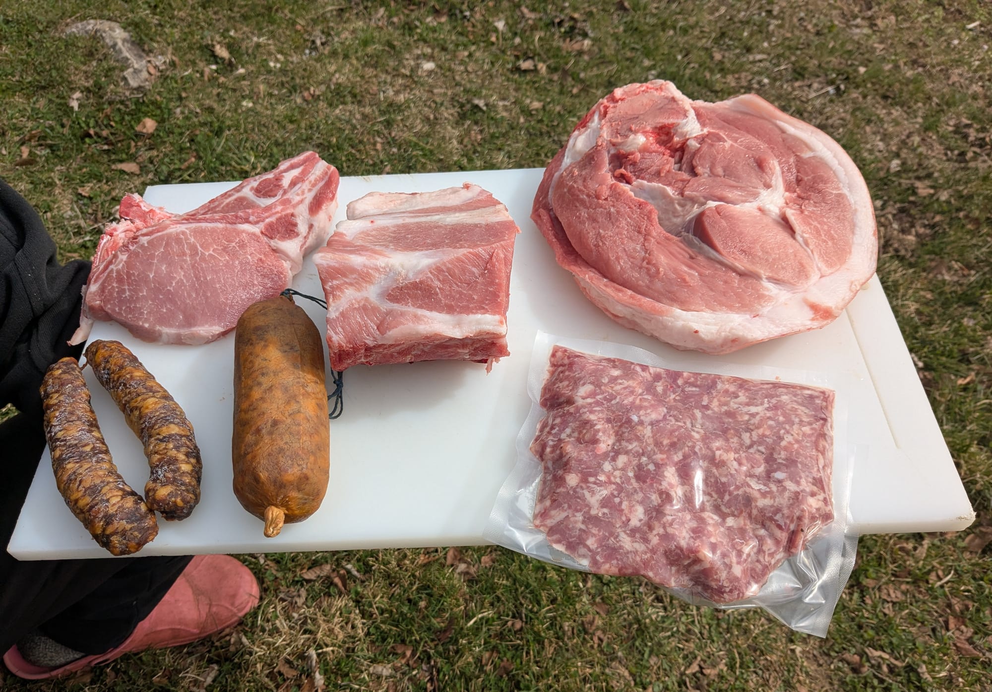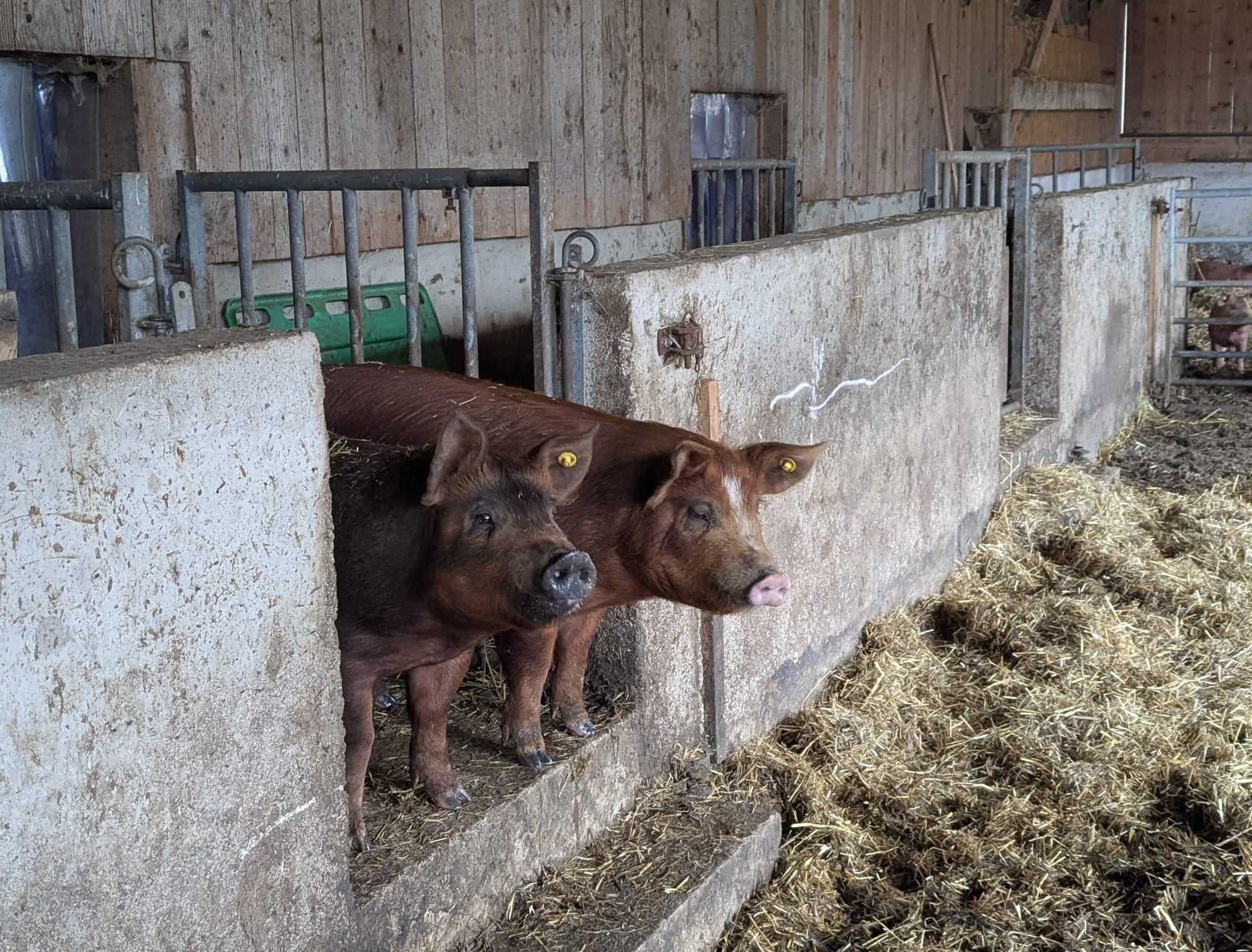 En parallèle, Augustin poursuit l'élevage de porcs adossé à la moutonnerie. Étant juste engraisseur, il achète les porcelets à deux mois. « C'est un croisement entre les races duroc et piétrain. Ils restent entre 6 et 8 mois sur la ferme avant de partir à l'abattoir. On en fait un ou deux par semaine. La viande est valorisée en viande fraîche ou en salaison. » Plus moutonnier que porcher, Augustin Cairey-Remonnay sait que dans le Haut-Doubs, on consomme traditionnellement plus de bœuf et de cochon que de mouton. Pas question d'arrêter le double élevage.