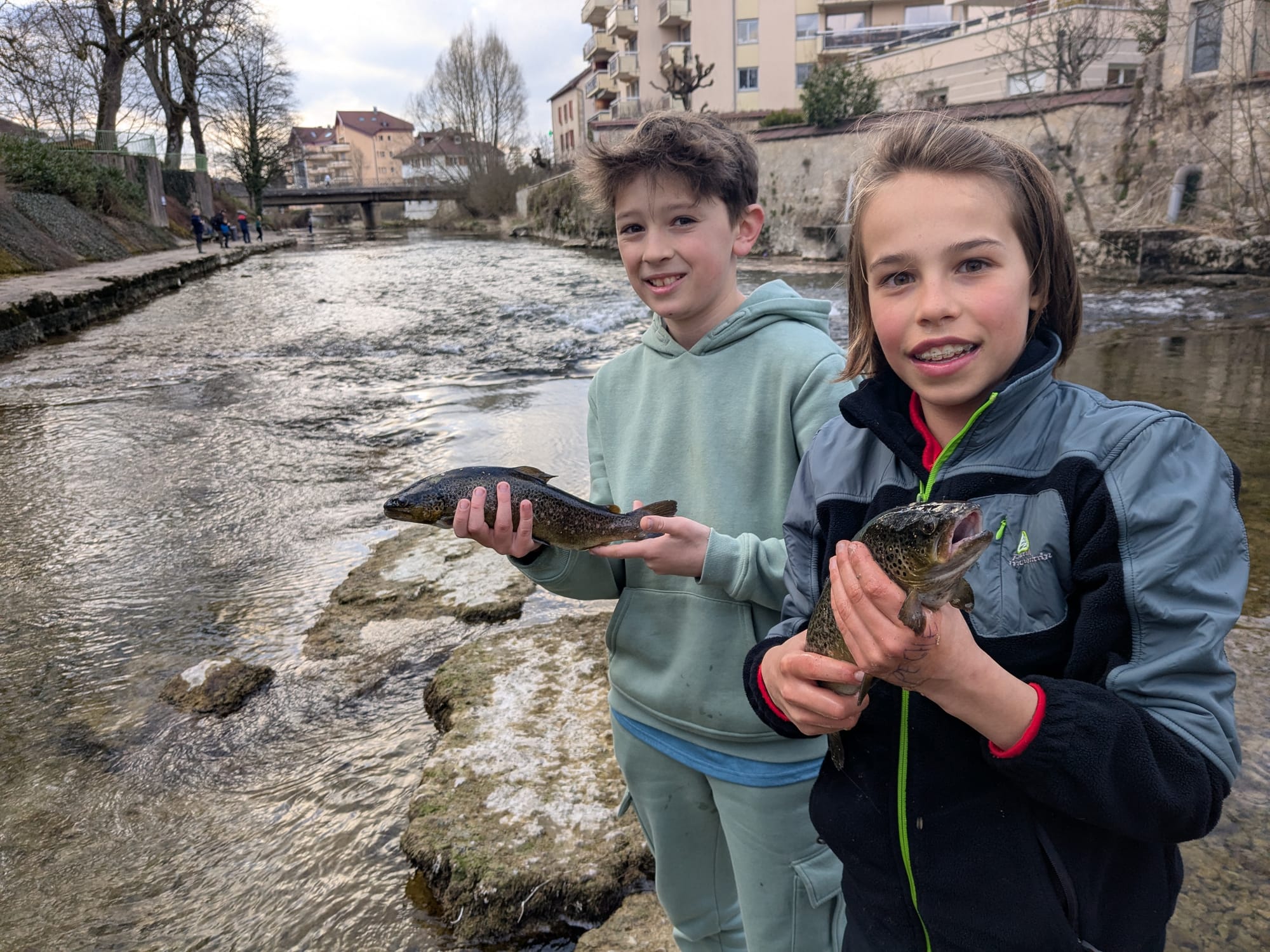 Les enfants pêcheurs – ils sont 127 à avoir pris leurs cartes cette année à la Truite pontissalienne – s’en donnent à cœur joie un jour après l’opération d’empoissonnage effectuée comme d’habitude quelques semaines après l’ouverture. Histoire de ferrer durablement l’effectif de la société de pêche. “C’est trop bien”, se réjouit Tao qui n’a pas mis longtemps à sortir de l’eau les 4 truites que tout pêcheur a le droit de prélever chaque jour. Son copain Léonce l’a imité. Les deux font la paire quand il s’agit d’aller taquiner la truite. “C’est mon parrain qui m’a appris à pêcher”, explique Léonce. “Moi, c’est mon papi”, précise son compère.