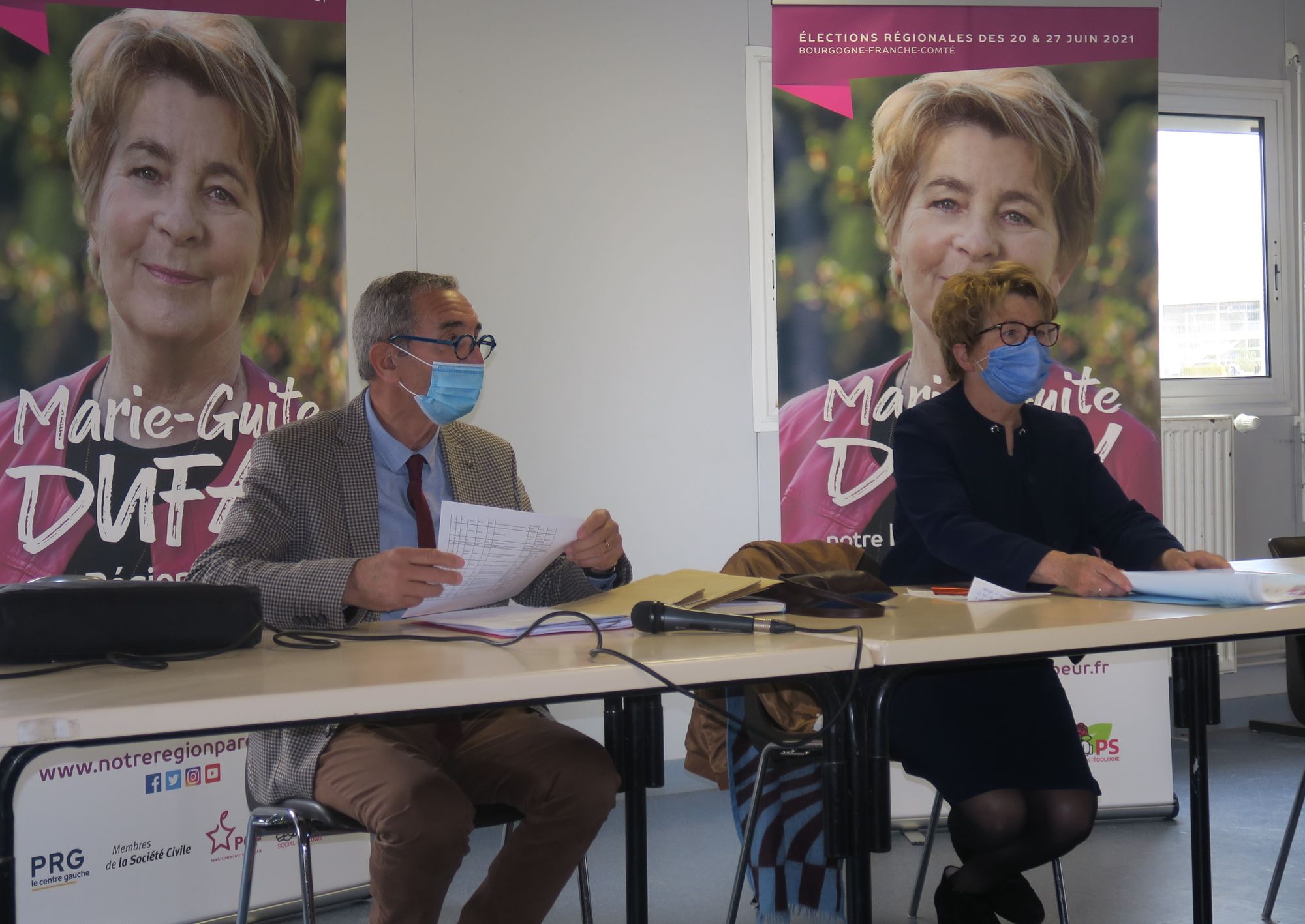Consciente que cette campagne des Régionales 2021 ne ressemblera pas aux précédentes, Marie-Guite Dufay, la présidente PS sortante candidate à sa propre succession, a présenté ce matin dans l'étrange salle VIP du stade Léo-Lagrange la liste des 21 co-listiers du Doubs pour ce scrutin régional qui se déroule les 20 et 27 juin prochains. "Une liste de gauche" a-t-elle insisté, composée de cadres du PS, dont elle et son bras droit Patrick Ayache et quelques autres élus sortants, composée également de nouvelles candidatures de gauche comme la maire de Bonnétage Valérie Pagnot (35 ans) ou encore Dominique Rizzon (66 ans), adjoint au maire de Chapelle-des-Bois. Il y a aussi une représentation communiste en la personne du Bisontin Matthieu Guinebert (25 ans), un peu de PRG (avec Salima Inazarene) et un peu de société civile avec notamment Christian Morel, adjoint et agriculteur à Saône (voir la liste complète en fin d'article).
