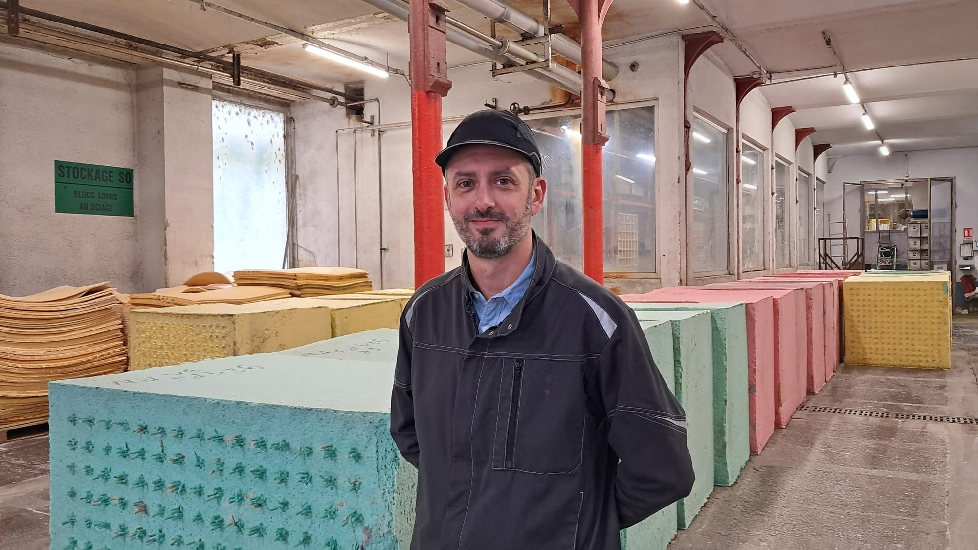 “J’ai l’habitude de dire que nous faisons ici de la pâtisserie. Nous mélangeons de la pâte de bois en feuilles (cellulose), du lin, des colorants et plusieurs produits, dont l’hydrogène sulfuré responsable de cette fameuse odeur, dans un “réacteur” de cuisson qui sort une dizaine de ces gros blocs de matériau brut”, ajoute M. Gouttefangeas.