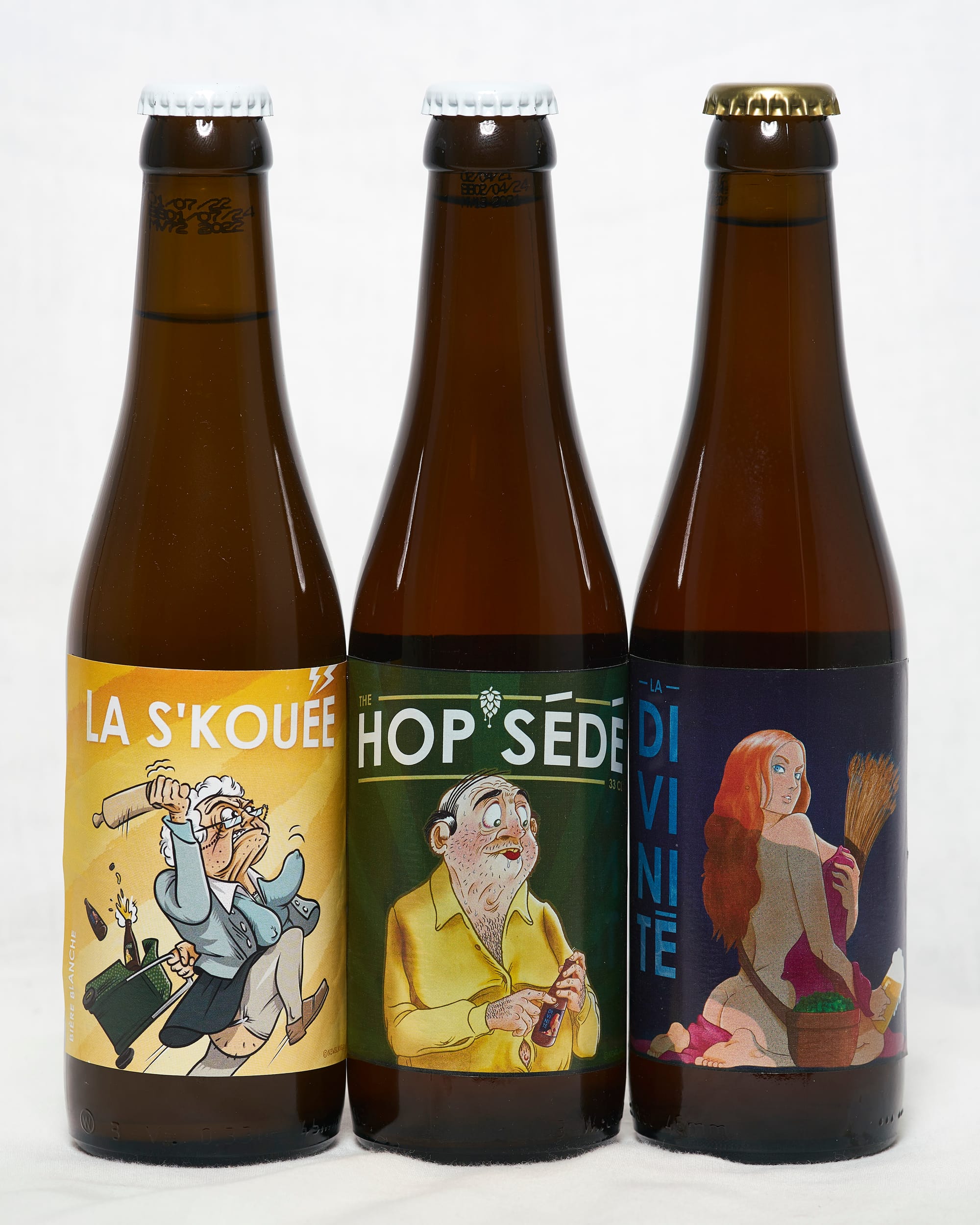Deux nouvelles spécialités rejoignent “La Divinité”, inspirée par Ninkasi, la déesse de la mythologie sumérienne. À l’époque (4100-1750 avant notre ère), les brasseurs étaient essentiellement des femmes. “La S’kouée” (bière blanche) et “L’Hop’sédé” (blonde houblonnée de type belge) complètent la gamme avant l’imminente arrivée d’une bière brune. “Nous avons demandé à un designer suisse, Thierry Matthey, de nous concevoir les étiquettes dans un style B.D., d’ailleurs les trois bières côte à côte, racontent une histoire que nous laissons découvrir à nos clients”, s’amuse Vivian.
