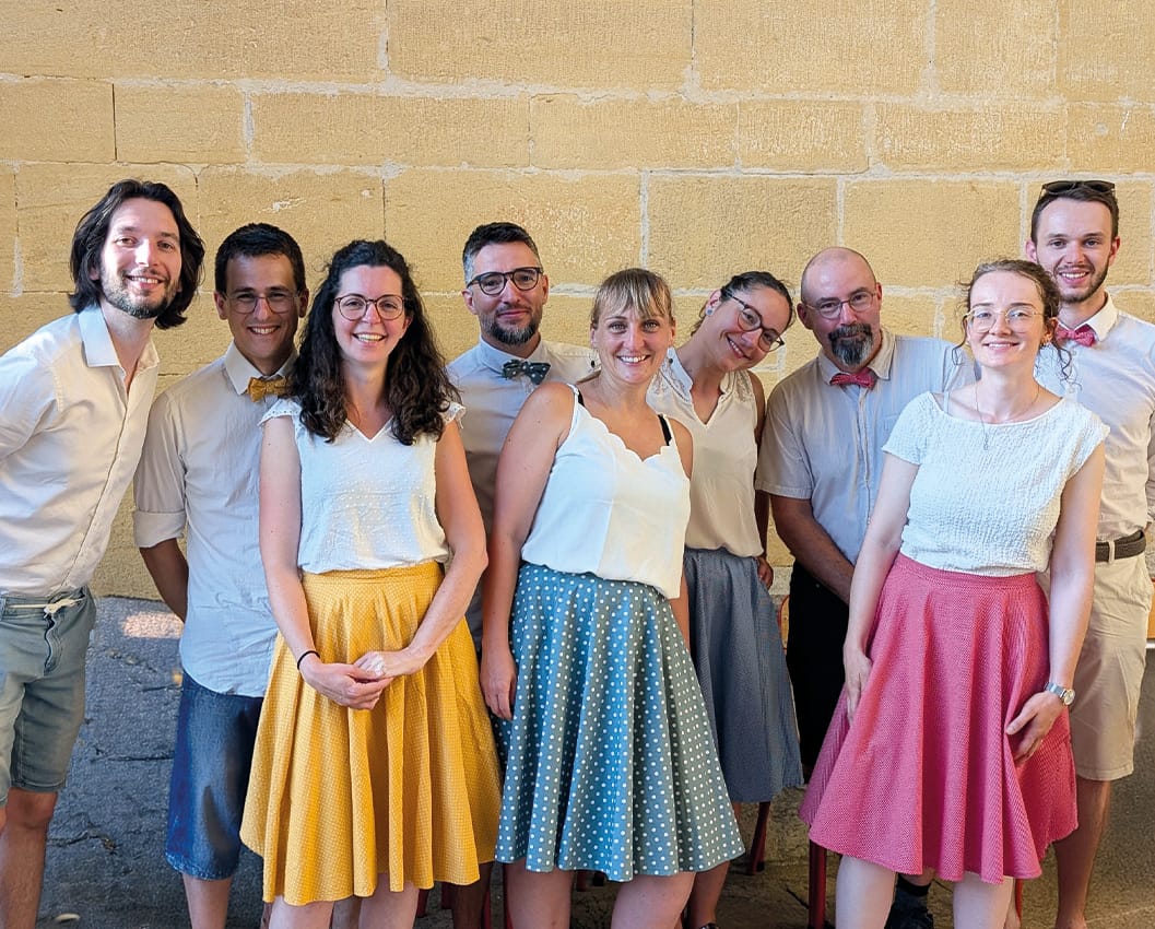 Le groupe est composé de plusieurs musiciens complices et complémentaires : trompettes, trombones, saxophones alto, ténor et baryton, clarinettes, flûte, piano, guitare basse, batterie et chant. Ambiance assurée.