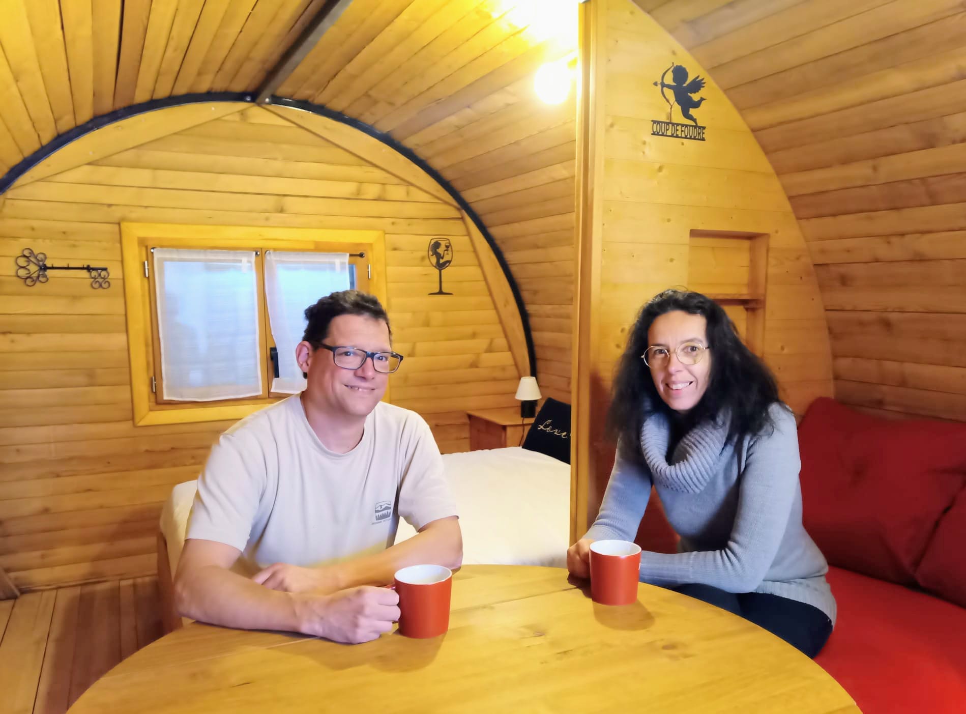 Si le tarif est à peine plus cher que les logements traditionnels, le tonneau possède tout le confort. Baptisé Le Coup de foudre, en référence à un tonneau de grande capacité mais aussi à l’expression relevant du vocabulaire amoureux, cet hébergement insolite est à destination des couples. Un deuxième lit simple peut aussi accueillir un enfant.