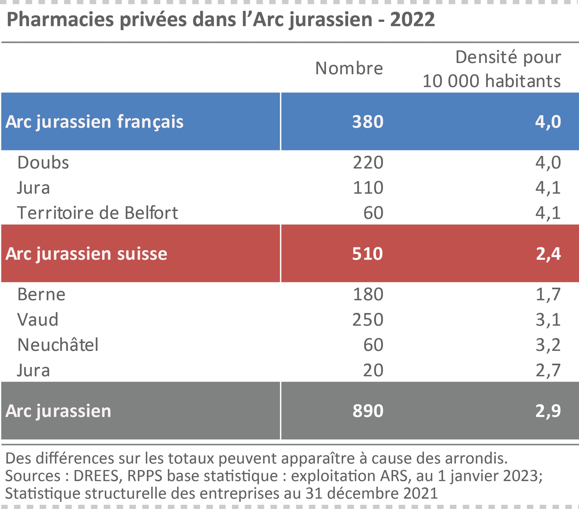 On dénombre 890 officines au 1er janvier 2023 dans l’Arc jurassien franco-suisse avec un meilleur maillage en France qui reflète une réglementation en lien avec la population.