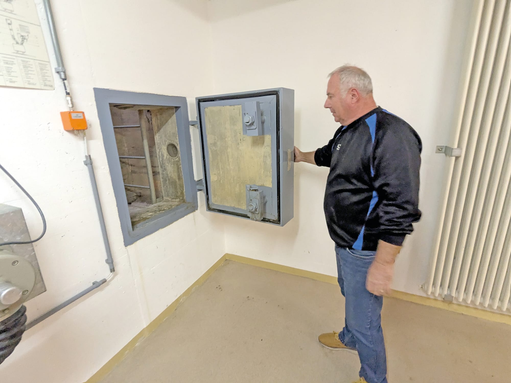 Ici, sous terre, le système de ventilation joue un rôle primordial. Celui-ci comprend la prise d’air, la valve anti-explosion et le préfiltre, l’appareil de ventilation et le filtre à gaz ainsi que la soupape de surpression par valve anti-explosion combinées. “Cet équipement est calibré pour produire 3 m3 d’air par heure et par place protégée. C’est la norme. S’il y a un souci électrique, on peut le faire fonctionner manuellement avec une manivelle.”