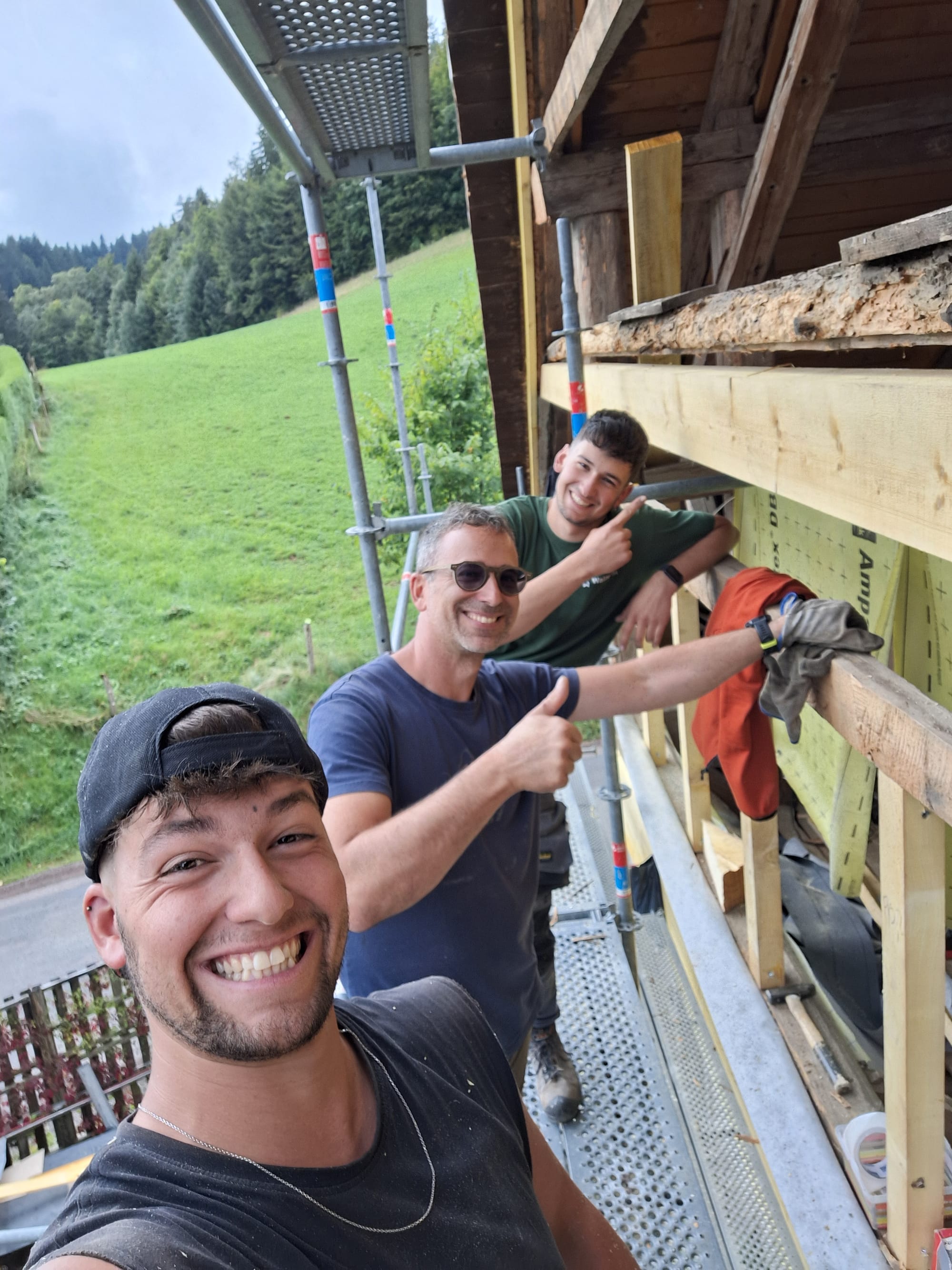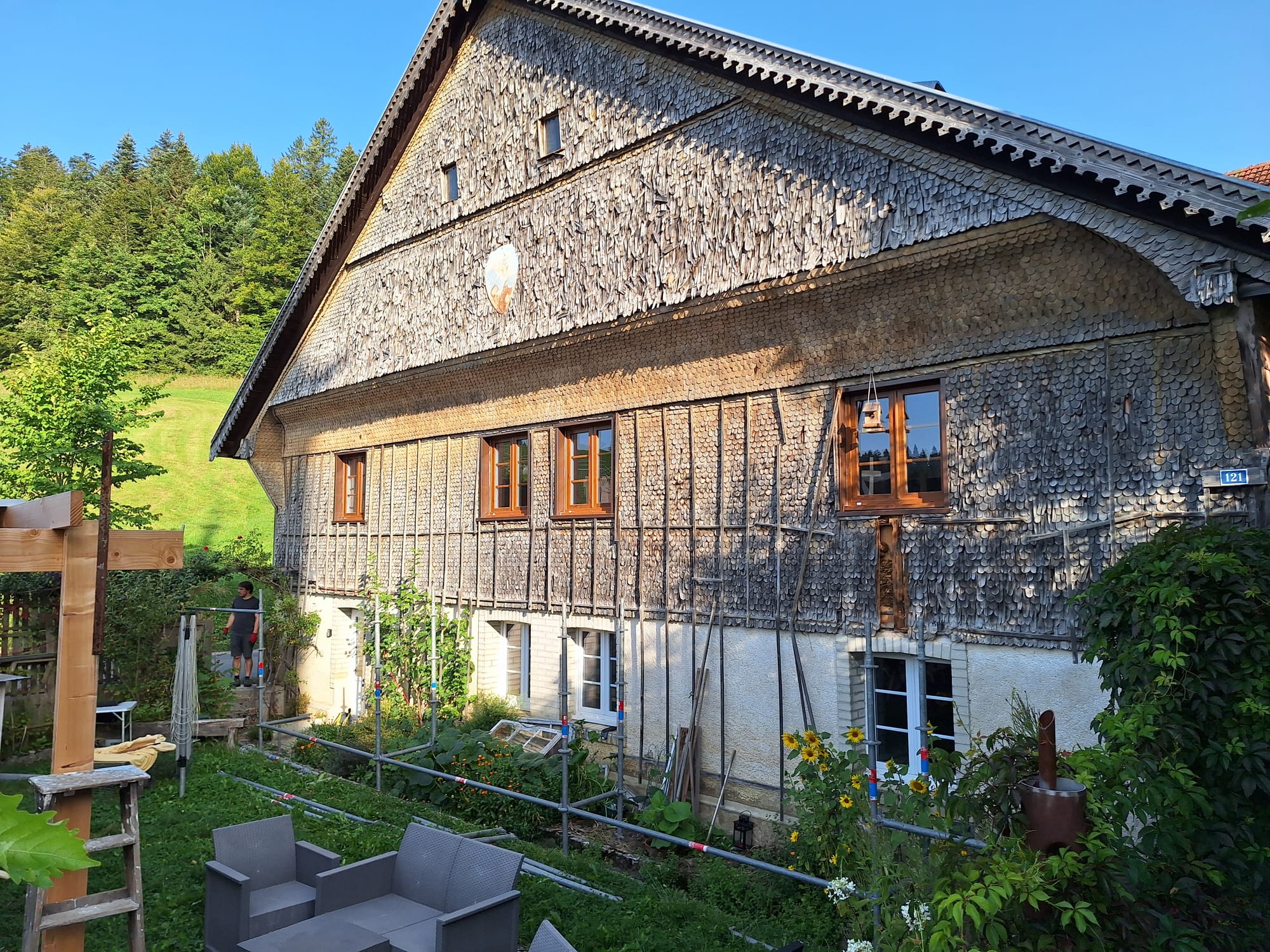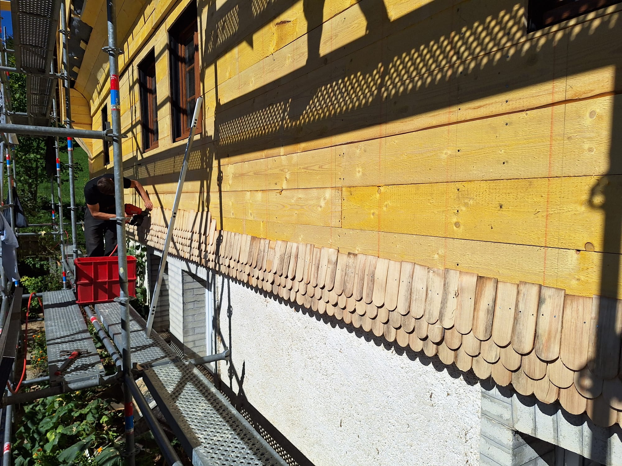 Originaire de Montlebon mais installé aujourd’hui à By, cet artisan est spécialisé dans les charpentes traditionnelles et la pose de tavaillons qu’il fend lui-même à la hache dans les règles de l’art. Le chantier prend d’abord une dimension familiale. En accord avec l’artisan qui installe l’échafaudage, Yves Huguenin et ses fils s’occupent eux-mêmes du démontage de l’ancienne façade. « On a commencé à la mi-août et cela nous a pris deux semaines. »