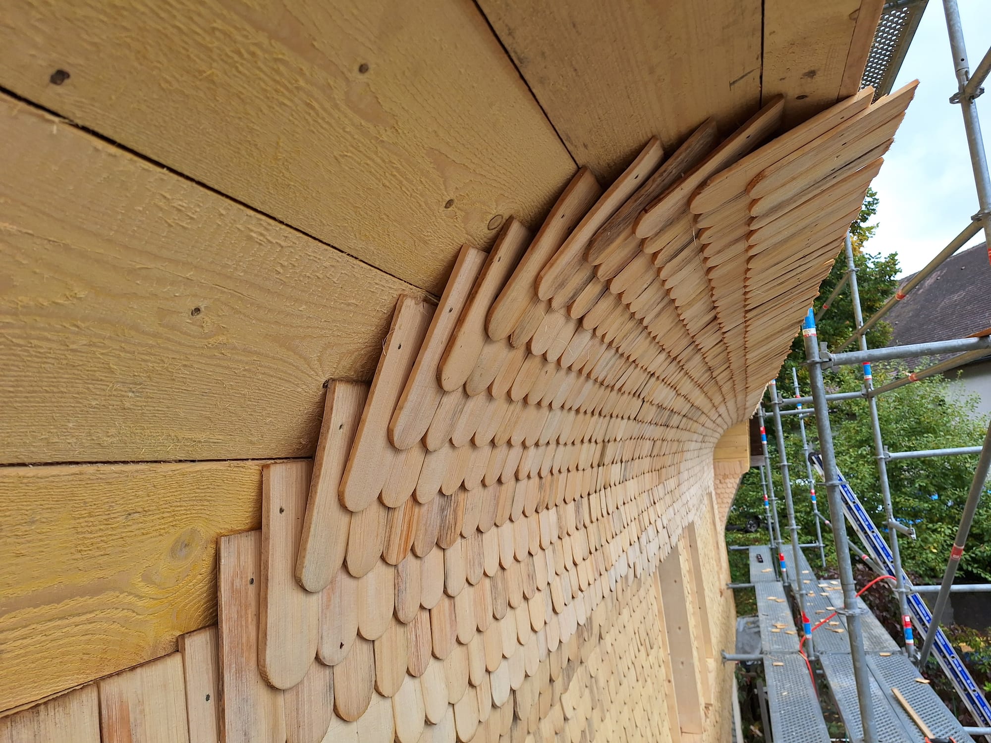 La structure porteuse des tavaillons est également en très mauvais état. Yves et ses fils dont l’un est menuisier remplacent les parties les plus dégradées. « On s’est fait conseiller par un ami de mon fils qui était charpentier. » Le fils menuisier a également réalisé de nouvelles planches de rives qui assurent une finition très décorative tout en protégeant les extrémités de la façade des agressions extérieures, notamment des infiltrations. « En faisant le choix du tavaillon, on privilégie un côté esthétique en gardant à l’esprit que la priorité, c’est d’abord l’étanchéité et la respiration de la façade. »